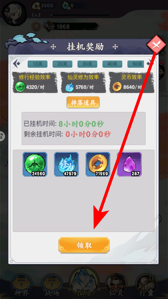 1、進(jìn)入掛機(jī)獎(jiǎng)勵(lì)界面,待掛機(jī)時(shí)長(zhǎng)積累后,點(diǎn)擊領(lǐng)取,獲取修行經(jīng)驗(yàn)、仙靈修為、靈幣等資源,用于提升角色與仙靈等級(jí)、強(qiáng)化戰(zhàn)力,為挑戰(zhàn)關(guān)卡做準(zhǔn)備。