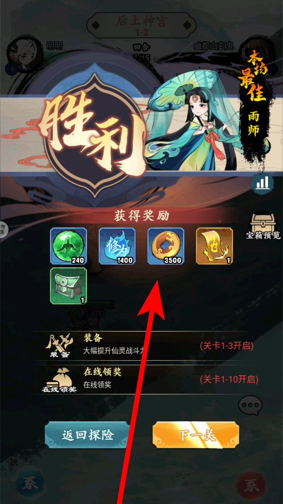 3、成功擊敗關(guān)卡敵人幽都山玄鬼后,彈出勝利界面,領(lǐng)取經(jīng)驗(yàn)、修為、靈幣、卷軸等獎(jiǎng)勵(lì),這些資源可繼續(xù)用于養(yǎng)成,點(diǎn)擊下一關(guān)開(kāi)啟新冒險(xiǎn),循環(huán)積累提升。