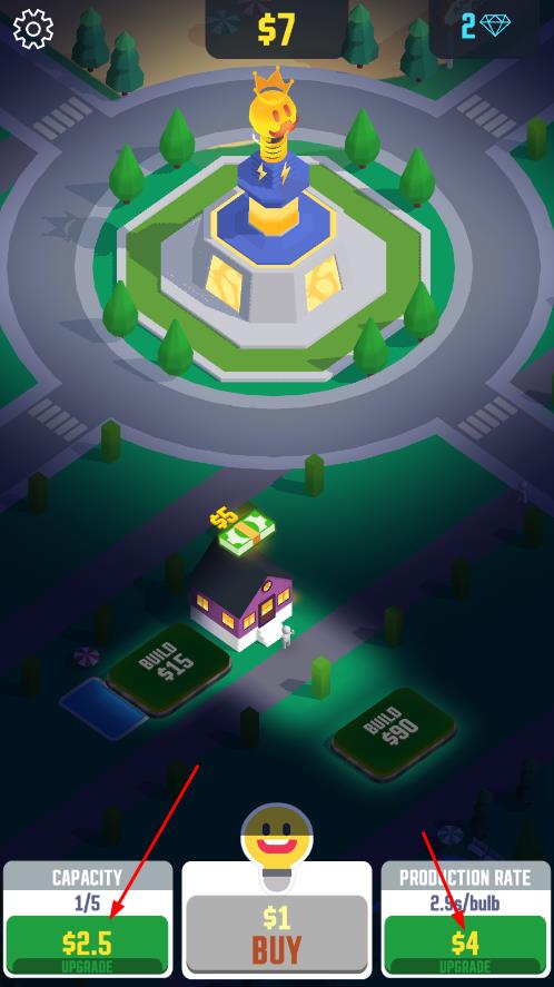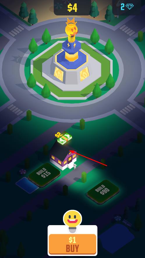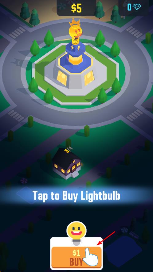 1、點擊【$1-BUY】按鈕購買燈泡,消耗金幣解鎖功能,為小鎮(zhèn)設施建設奠定基礎。