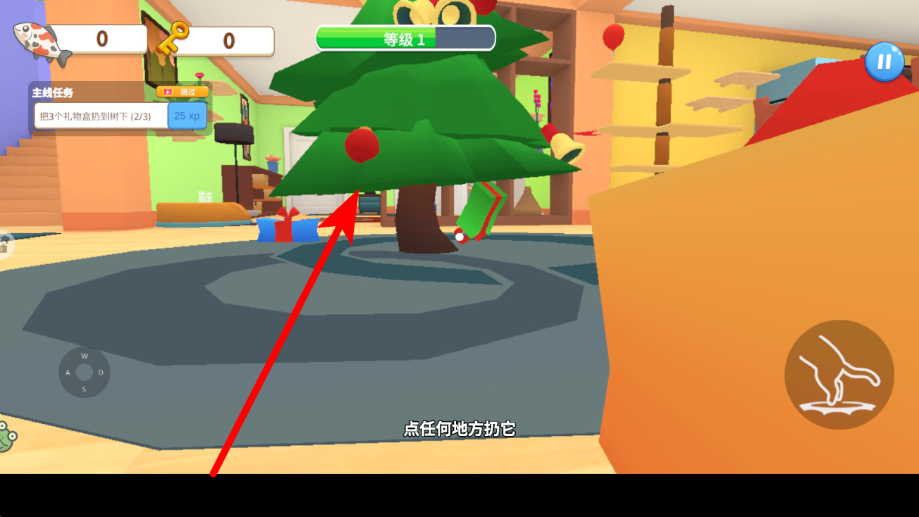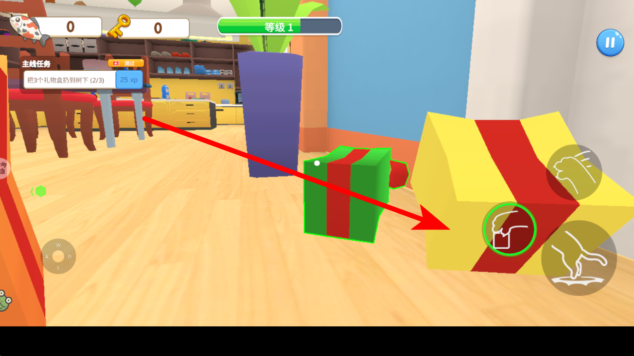 1、開(kāi)始游戲,查看主線任務(wù),如把3個(gè)禮物盒扔到樹(shù)下,在場(chǎng)景找到禮物盒,點(diǎn)擊交互按鈕拿起,移動(dòng)至樹(shù)下區(qū)域,點(diǎn)擊投擲完成任務(wù)步驟。