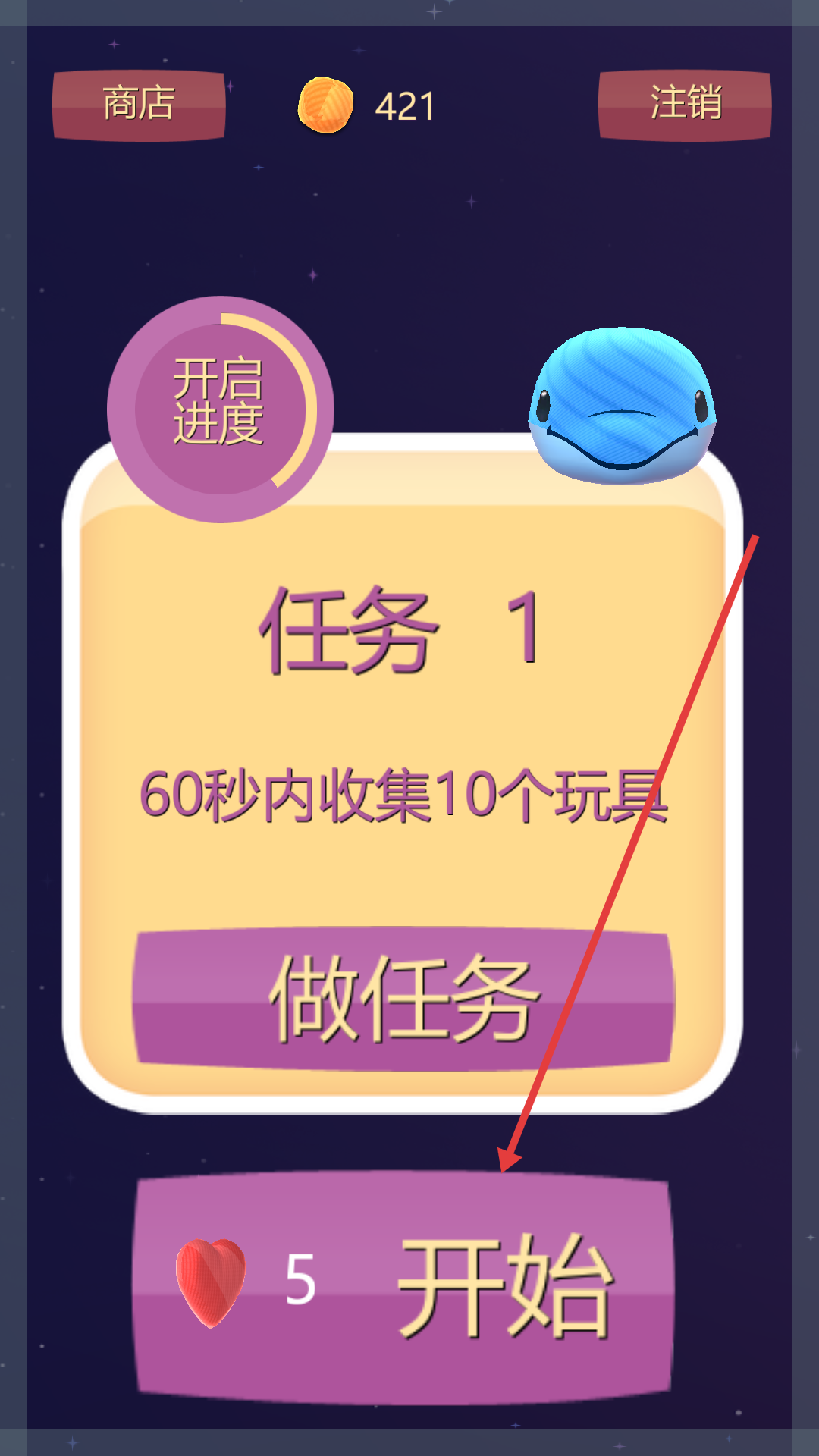 1、任務(wù)頁(yè)點(diǎn)開(kāi)始,消耗5愛(ài)心,進(jìn)入60秒內(nèi)收集10個(gè)玩具關(guān)卡。