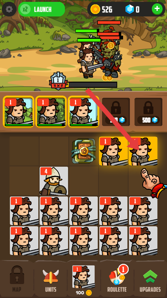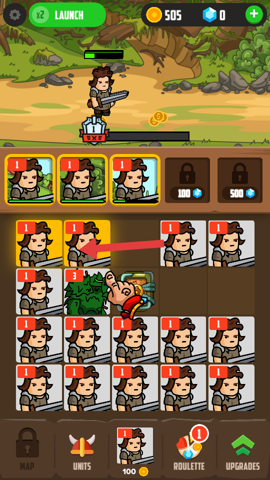 1、進(jìn)入游戲的頁(yè)面,需要拖動(dòng)相同的等級(jí)勇士,如1級(jí)進(jìn)行合并,升級(jí)為高等級(jí)單位3級(jí)、5級(jí),強(qiáng)化戰(zhàn)力。