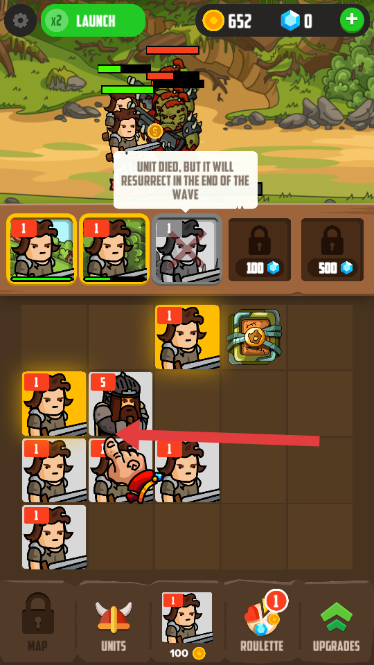 2、湊齊強(qiáng)力陣容后,出現(xiàn)LAUNCH表示在進(jìn)行出擊,勇士自動(dòng)與怪物戰(zhàn)斗,注意觀察血量,適時(shí)的合并補(bǔ)位。