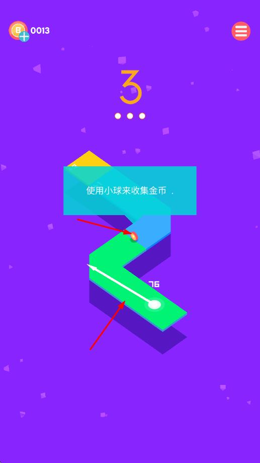 1、第3關(guān)依提示-操控小球沿綠藍路徑-朝著【紅色金幣】方向-按箭頭指引移動收集。