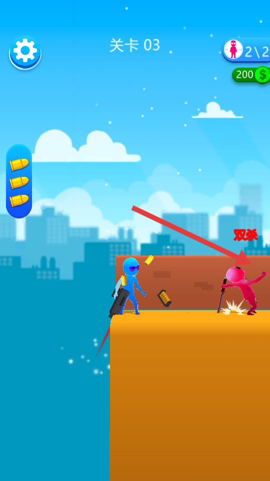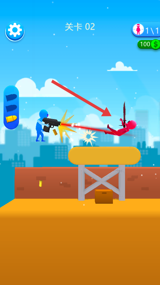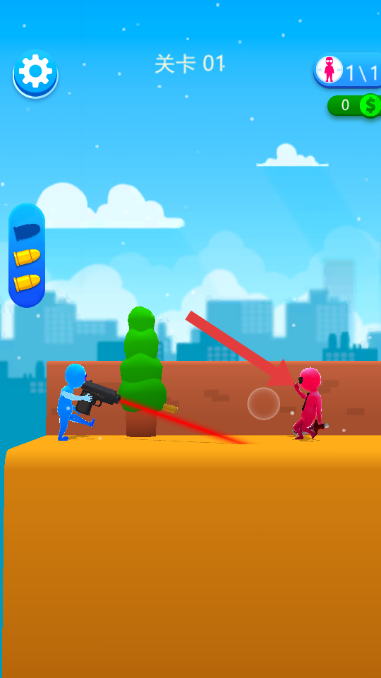 1、開啟關(guān)卡01,操控藍(lán)色小人射擊紅敵人,戰(zhàn)斗獲金幣,積累后可用于角色或武器升級(jí),助力后續(xù)關(guān)卡。