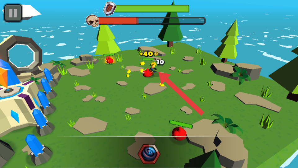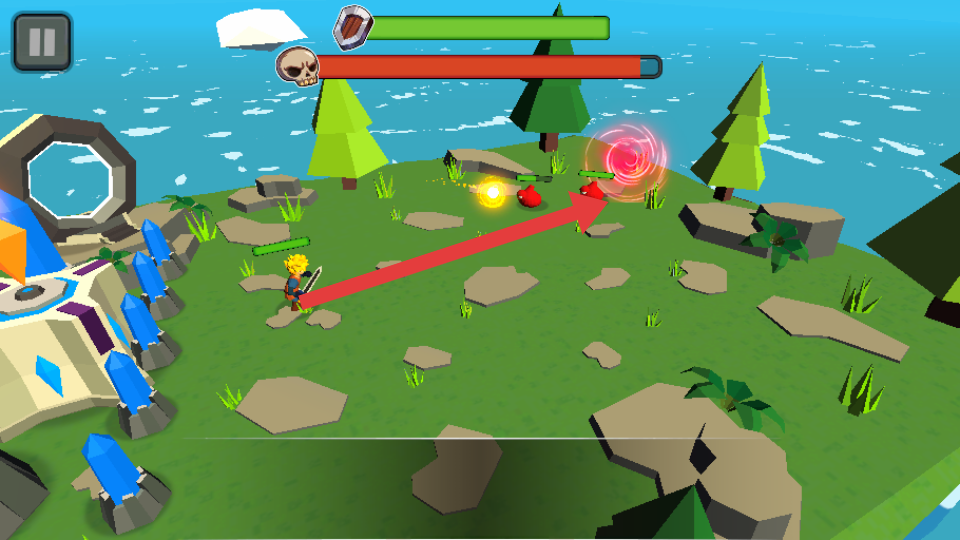 1、進入游戲關(guān)卡,操控角色靠近紅色怪物,點擊攻擊鍵發(fā)起戰(zhàn)斗,利用武器輸出傷害,躲避反擊,削減敵人血條。