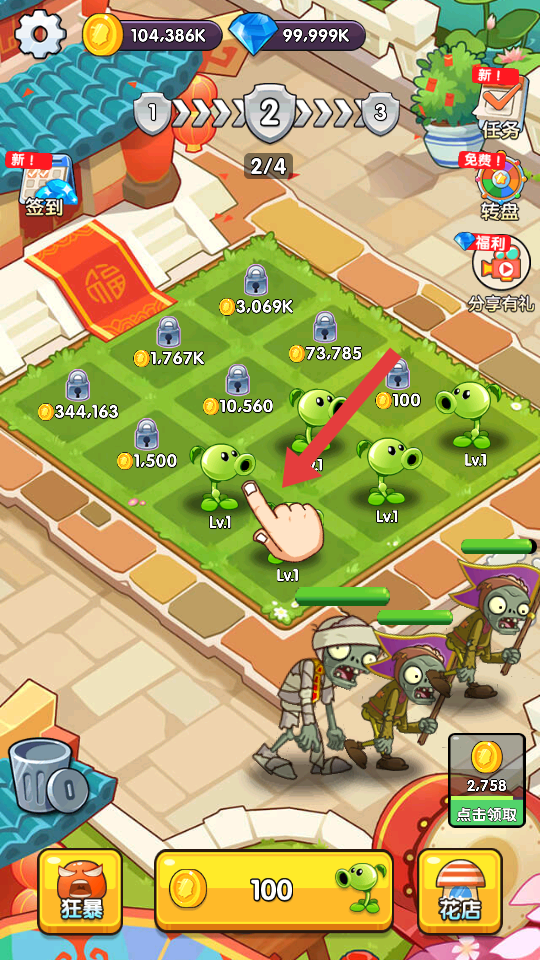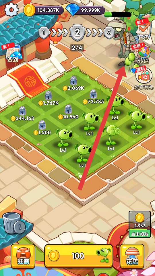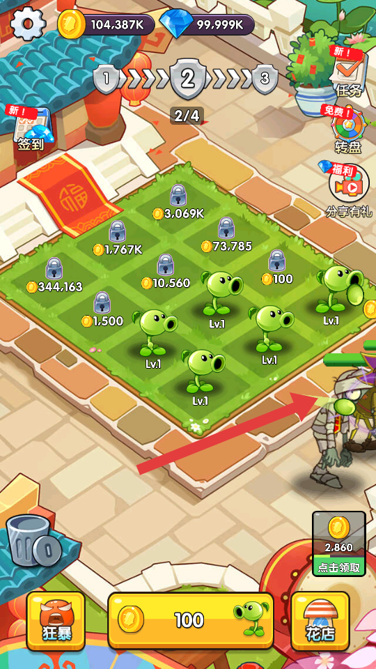 3、推進(jìn)關(guān)卡時,留意右上角的任務(wù)與福利入口,完成任務(wù)可獲取獎勵;遇到大量僵尸時,提升植物攻擊的效率。