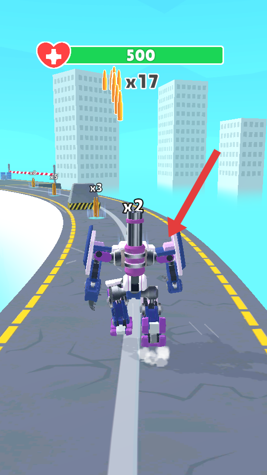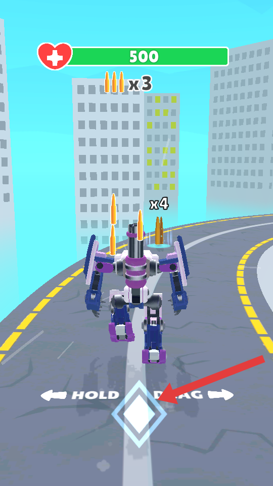 1、進(jìn)入游戲,長(zhǎng)按拖動(dòng)HOLD DRAG區(qū)域,控制機(jī)器人左右移動(dòng),收集道路上的x3彈藥,規(guī)避障礙前行。