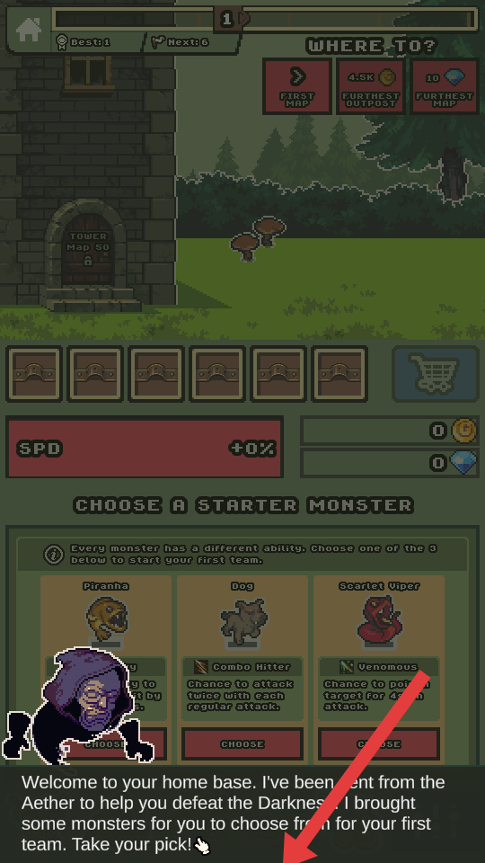 1、進(jìn)入游戲基地,在CHOOSE A STARTER MONSTER區(qū)域,從Piranha、Dog、Scarlet Viper中選擇一只怪物。