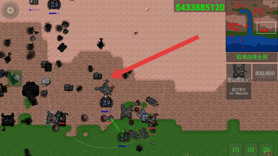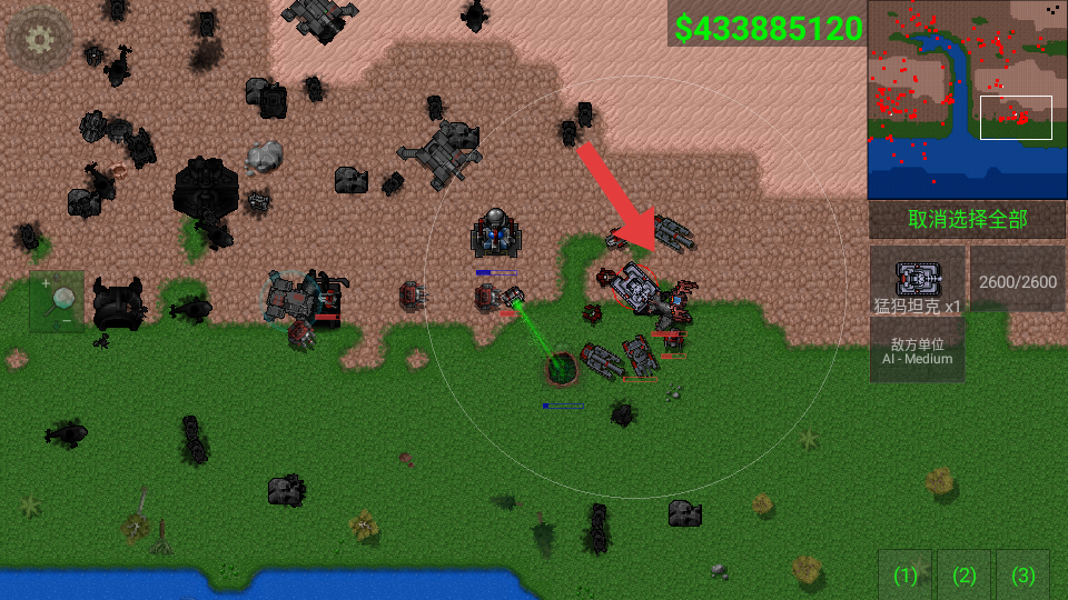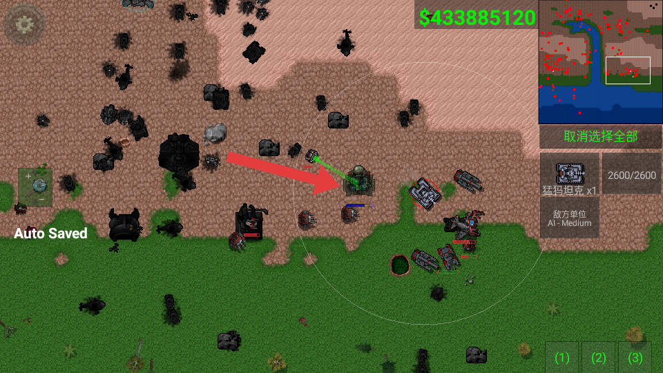 3、緊跟右上角小地圖顯示的敵方動向,遭遇標注AI-Medium的敵方單位時,集中已方兵力發(fā)起攻擊,摧毀重型坦克等。