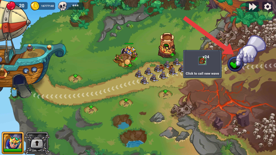 3、緊跟界面提示找到按鈕,按需點(diǎn)擊召喚新波次敵人,提前用英雄技能和建筑火力瞄準(zhǔn)高威脅敵人,確保血量。