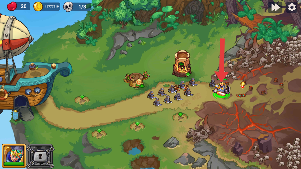 1、點(diǎn)擊英雄并拖動(dòng)至指定位置完成部署,同時(shí)沿路徑建造帶綠色箭頭標(biāo)識(shí)的士兵營(yíng)地,這是搭建初始防線(xiàn)的操作。