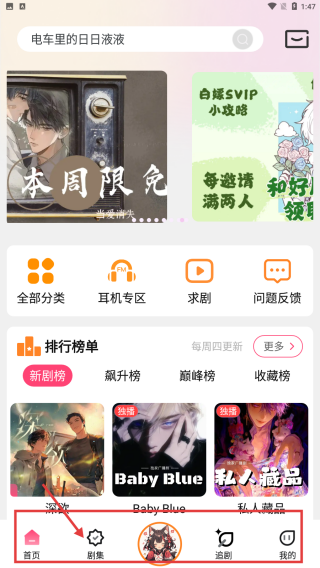 1、打開(kāi)應(yīng)用,點(diǎn)擊底部劇集選項(xiàng),進(jìn)入劇集分類(lèi)頁(yè)面查找內(nèi)容。