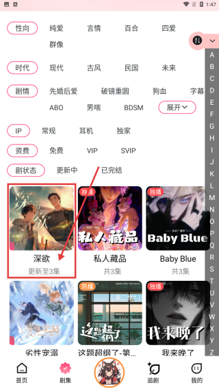 2、在劇集頁(yè)面,找到深欲作品封面,點(diǎn)擊進(jìn)入作品詳情頁(yè)。