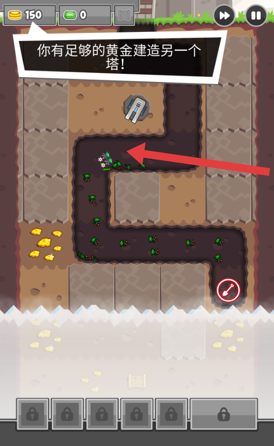 2、依照地下路徑走向補(bǔ)建防御塔,利用冰塔減速等特性攔截?cái)橙?,要注意收集路徑上的金幣,確保資源的充足。