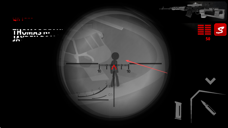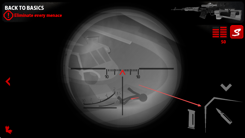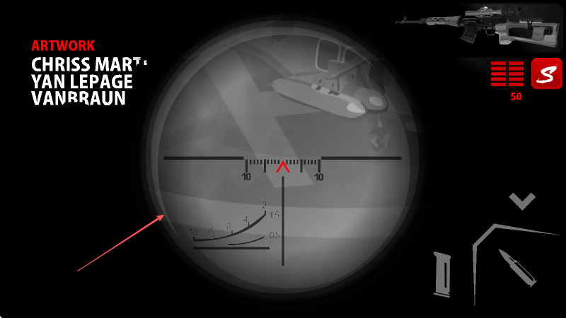 1、進入游戲,觀察狙擊鏡界面,熟悉刻度和標識,留意左上角ARTWORK下方的信息,了解關卡背景。