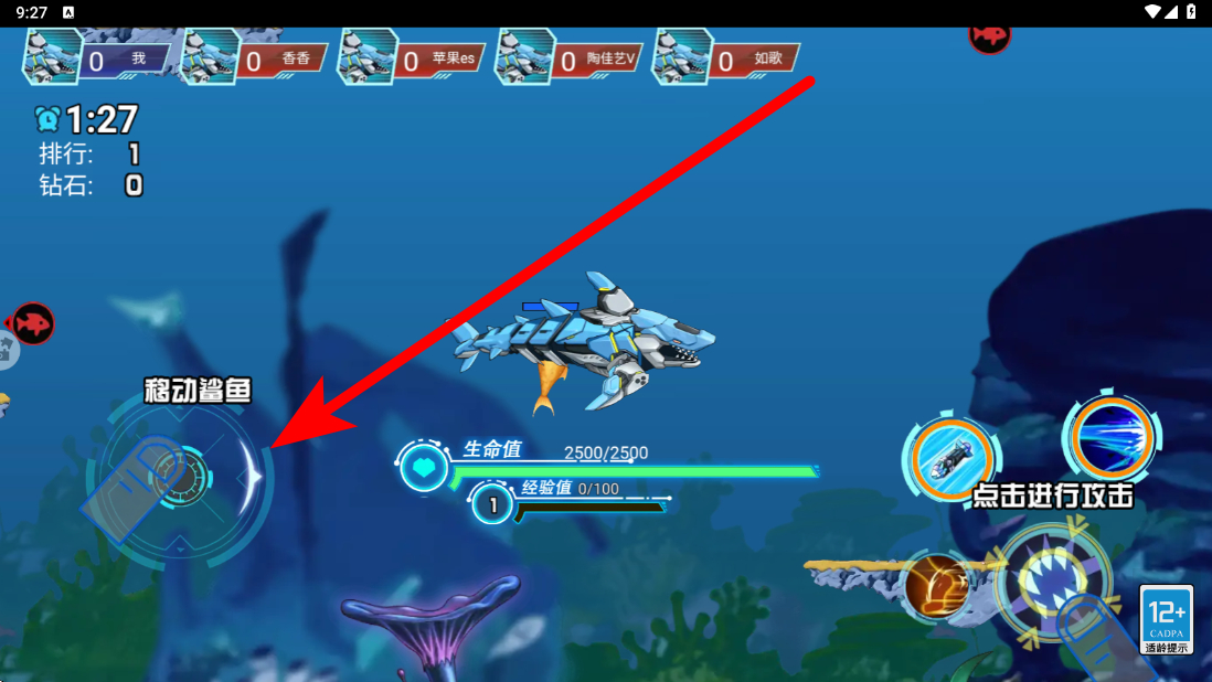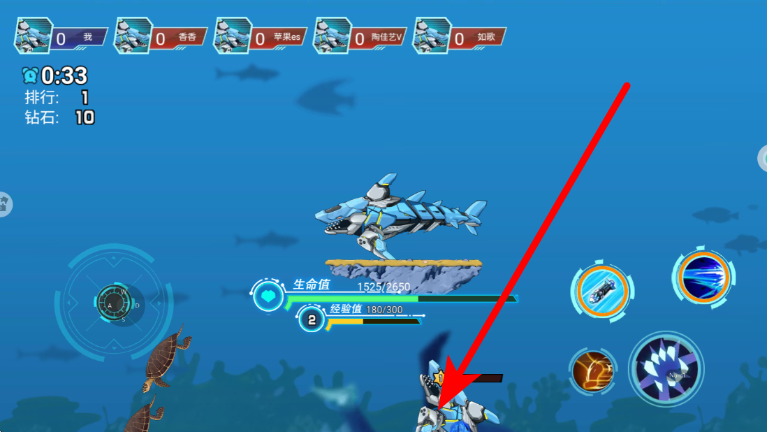 1、進入應用后,在戰(zhàn)斗界面,通過左側操作區(qū)域操控機甲鯊魚移動,靈活調整位置,以更好應對戰(zhàn)場情況,尋找合適的戰(zhàn)斗時機。
