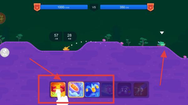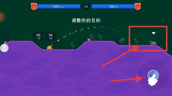 1、開局先看【調(diào)整你的目標(biāo)】提示,瞄準(zhǔn)敵方位置,點擊右側(cè)操作區(qū)域來調(diào)整射擊角度。