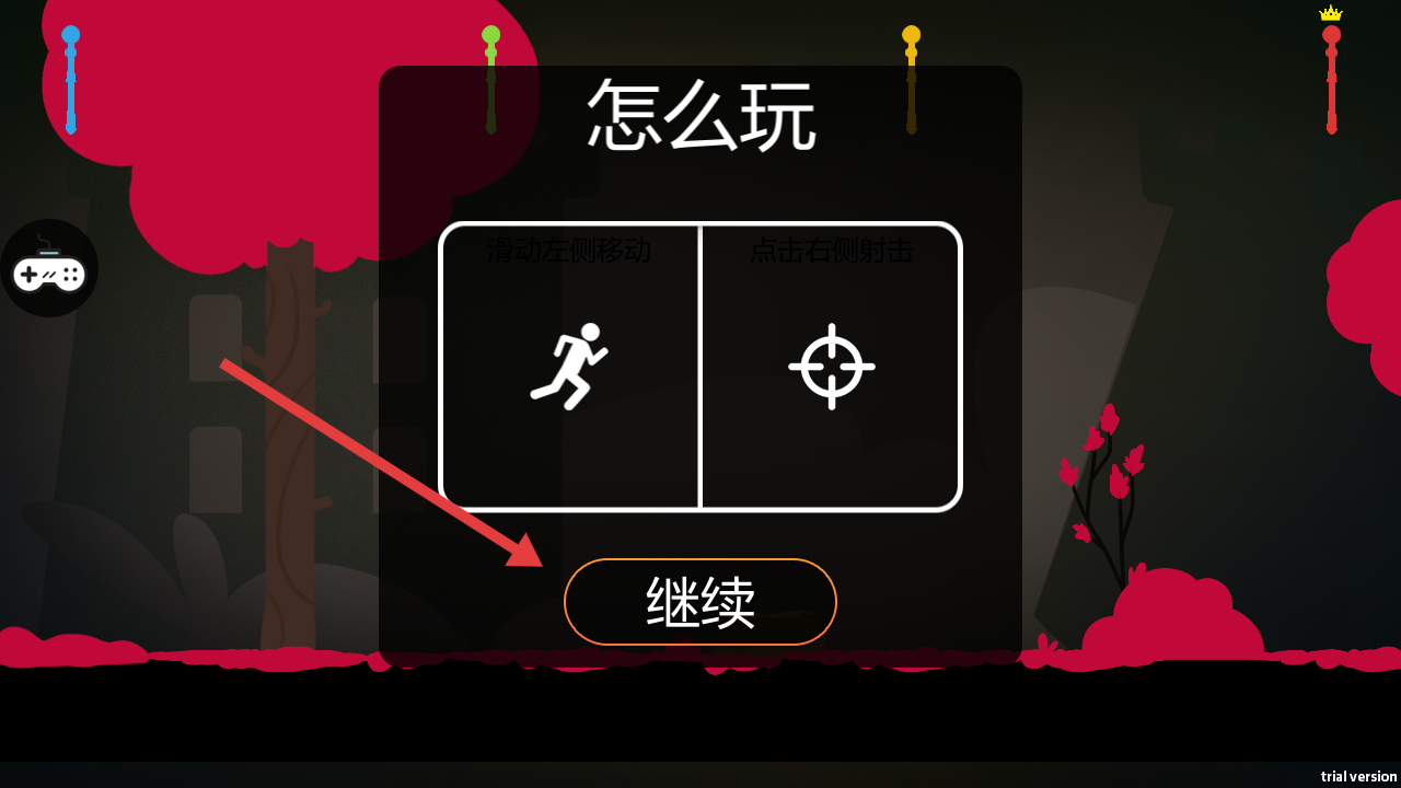 1、在怎么玩提示界面,點(diǎn)擊繼續(xù),進(jìn)入游戲,游戲操作方式為滑動(dòng)左側(cè)屏幕控制移動(dòng),點(diǎn)擊右側(cè)屏幕進(jìn)行射擊。