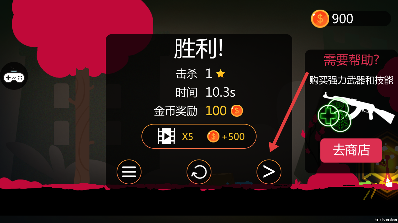 3、成功擊敗敵人后,會(huì)顯示勝利界面,可查看擊殺數(shù)、用時(shí)和金幣獎(jiǎng)勵(lì),點(diǎn)擊右側(cè)箭頭按鈕可進(jìn)入下一關(guān),也可去商店購買強(qiáng)力武器和技能。
