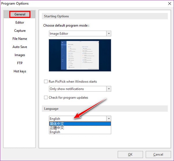 PicPick軟件打開后如果默認(rèn)是英文界面,可以在File→Options→General→Languages處將語言設(shè)置為簡體中文,如下圖所示: