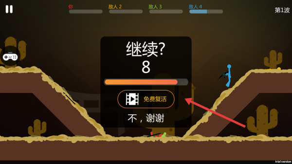 3、如果戰(zhàn)斗失敗,會(huì)彈出繼續(xù)的提示框,可以選擇免費(fèi)復(fù)活繼續(xù)戰(zhàn)斗,也可以選擇不謝謝結(jié)束本局。