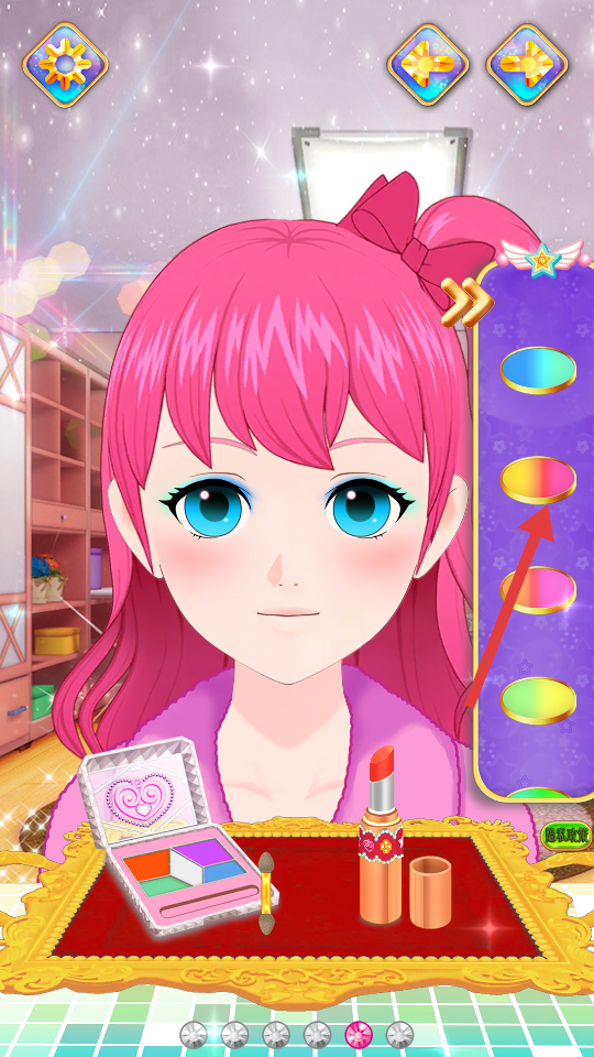 3、妝容與服裝適配:化妝界面會(huì)根據(jù)當(dāng)前公主穿戴的服裝風(fēng)格,推薦適配的妝容單品,比如穿禮服時(shí)推薦精致唇妝與閃片眼影,穿日常裙裝時(shí)推薦清新裸妝,建立審美認(rèn)知。