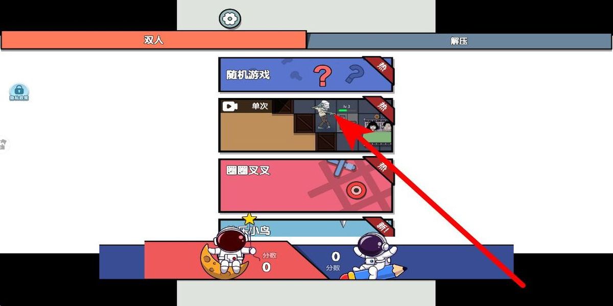 1、進(jìn)入游戲應(yīng)用后,在玩法選擇界面,有隨機(jī)游戲單次等多種玩法可供挑選,玩家可根據(jù)喜好,選擇其中一種玩法,開(kāi)啟雙人挑戰(zhàn)。