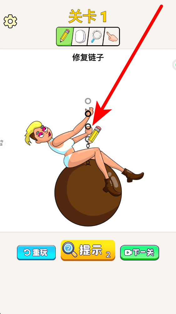 2、新手在游戲關(guān)卡1中,根據(jù)任務(wù)要求修復(fù)公主抓的鏈子,使用提供的工具,進(jìn)行相應(yīng)操作,嘗試解決關(guān)卡中的難題,推進(jìn)游戲進(jìn)程。