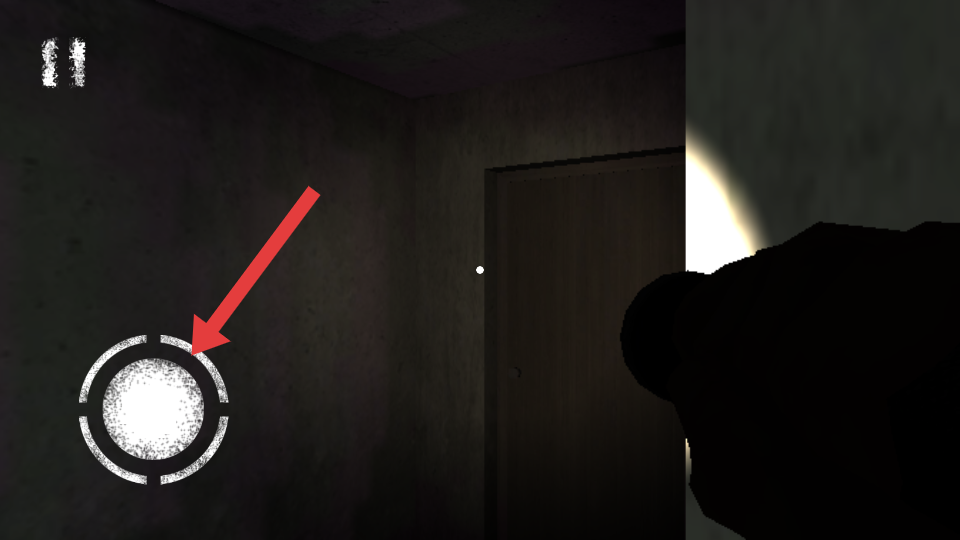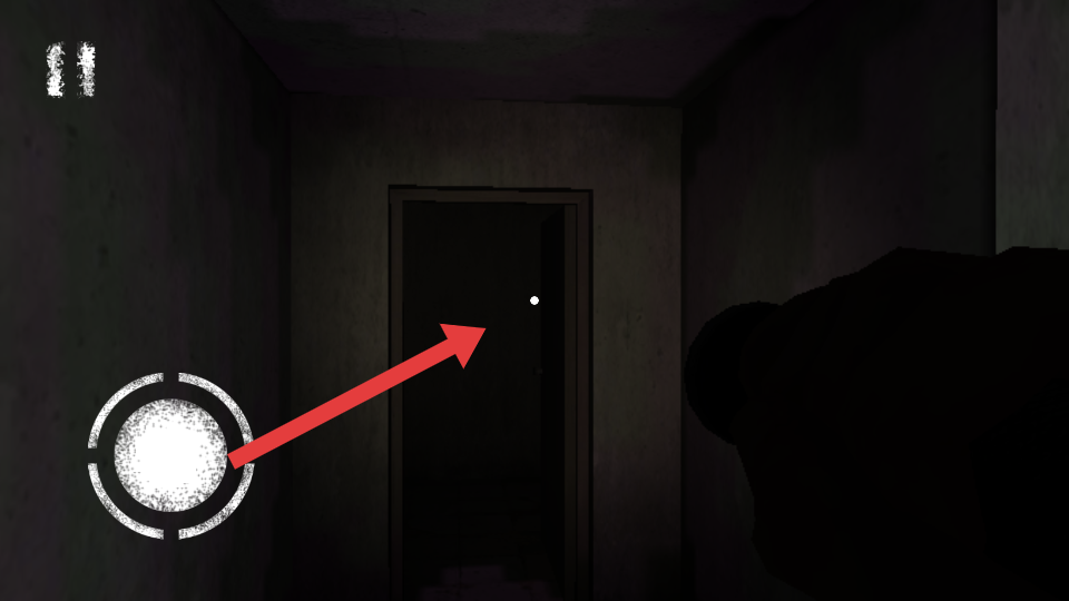 1、進(jìn)入昏暗房間后,借助左側(cè)操控區(qū)域移動,利用光照查看周圍,重點(diǎn)靠近木門嘗試互動開啟,以此探索新區(qū)域。