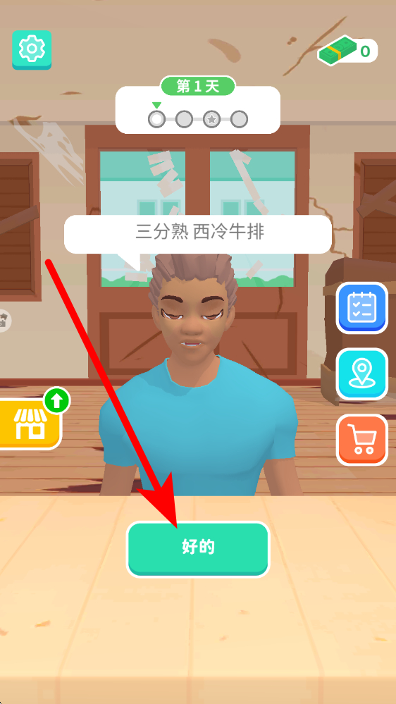 1、開始游戲時(shí),當(dāng)顧客提出菜品需求三分熟西冷牛排時(shí),點(diǎn)擊好的,接受訂單,開啟菜品制作流程,為后續(xù)烹飪做好準(zhǔn)備。