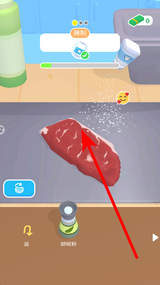 2、進(jìn)入食材處理的環(huán)節(jié),可以對(duì)食材牛排進(jìn)行腌制,根據(jù)提示添加調(diào)料鹽、胡椒粉等,讓食材更加具風(fēng)味,為烹飪打下基礎(chǔ)。