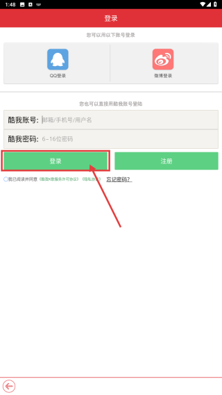 3、在登錄界面,輸入酷我賬號和密碼,點擊登錄按鈕,完成賬號登錄操作。