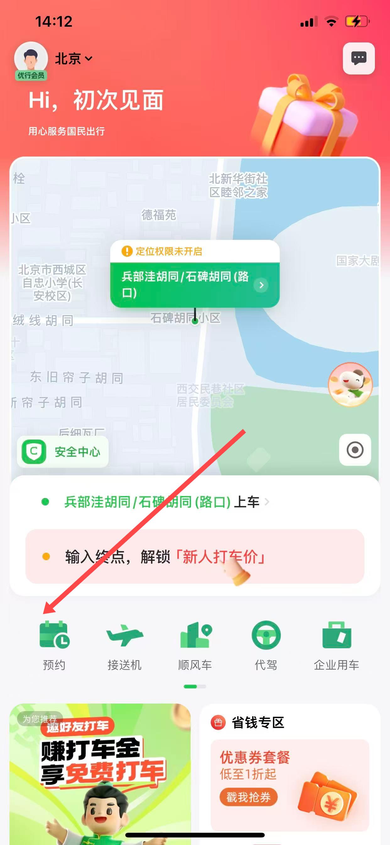 1、打開曹操出行App,進入主界面后,找到并點擊預約選項,進入預約用車頁面。
