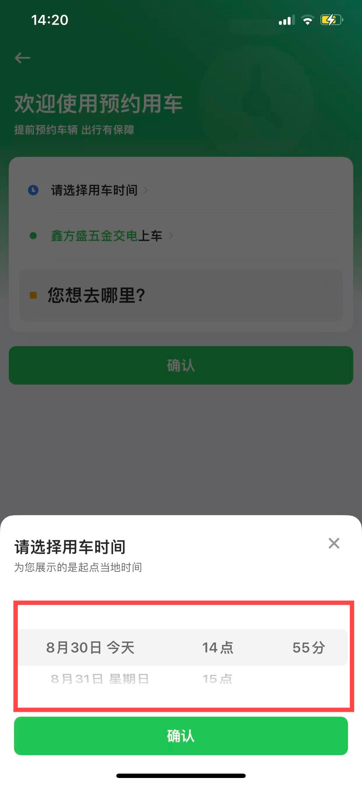 2、在預約用車頁面,點擊請選擇用車時間選項,選擇日期和時間。
