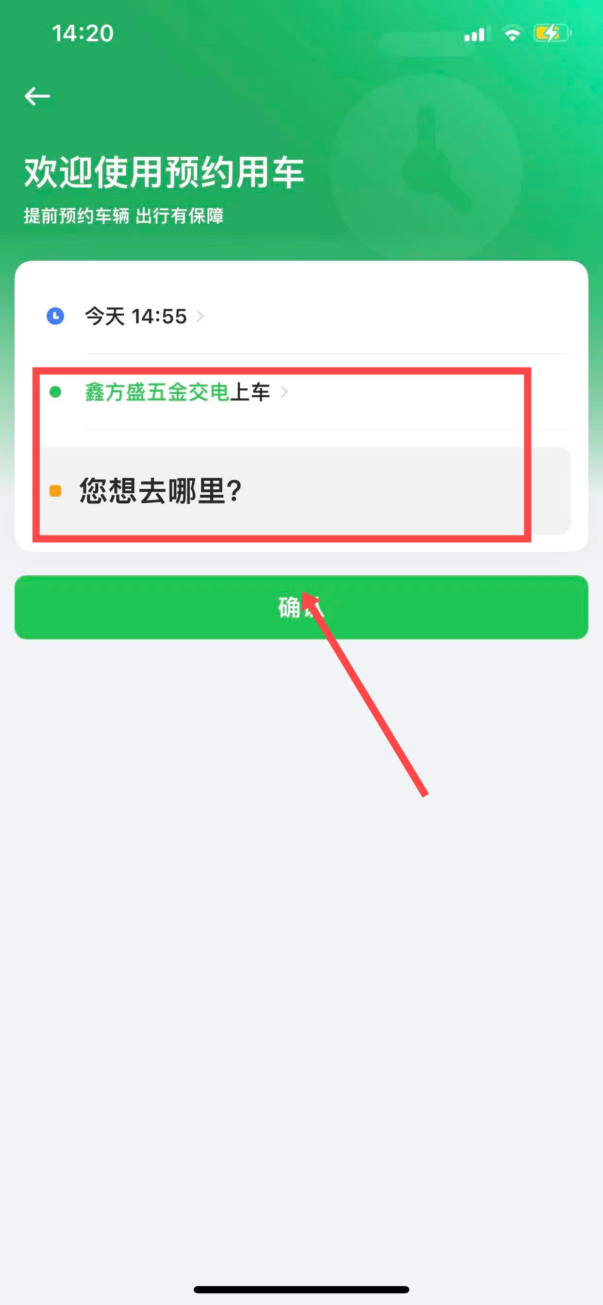 3、輸入上車地點和行程的目的地后,點擊確認。