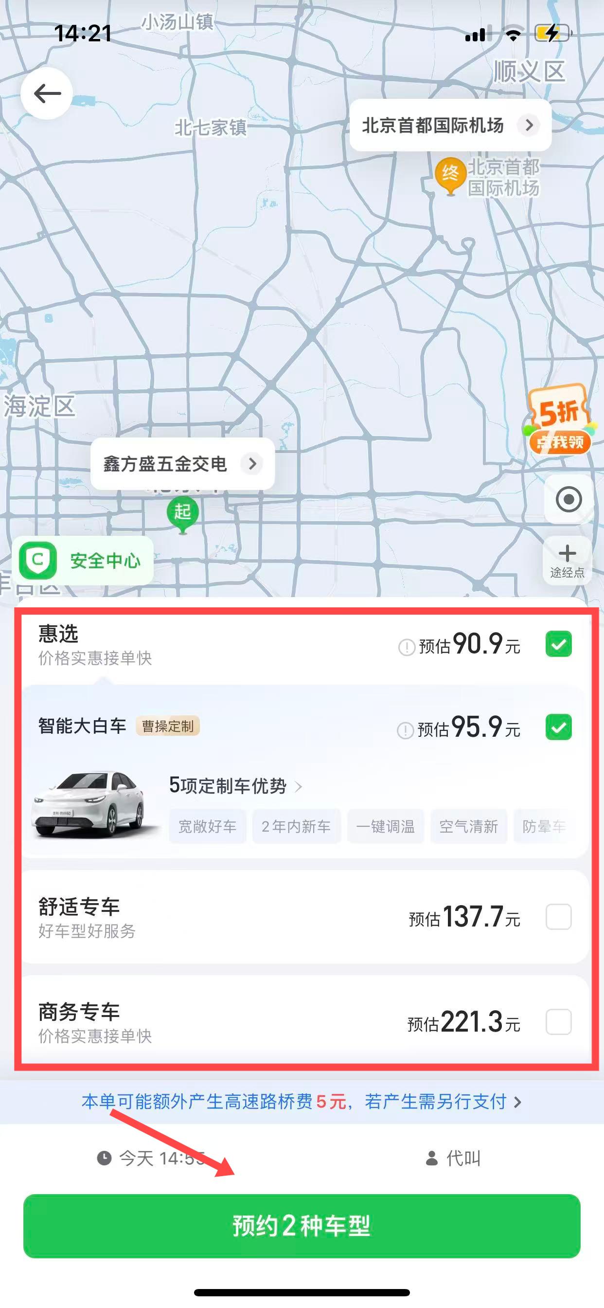 4、顯示不同的車型選項,如惠選、智能大白車、舒適專車、商務專車等,根據自身需求和預算進行選擇,點擊預約XX車型按鈕,完成預約。