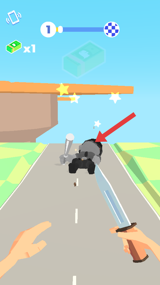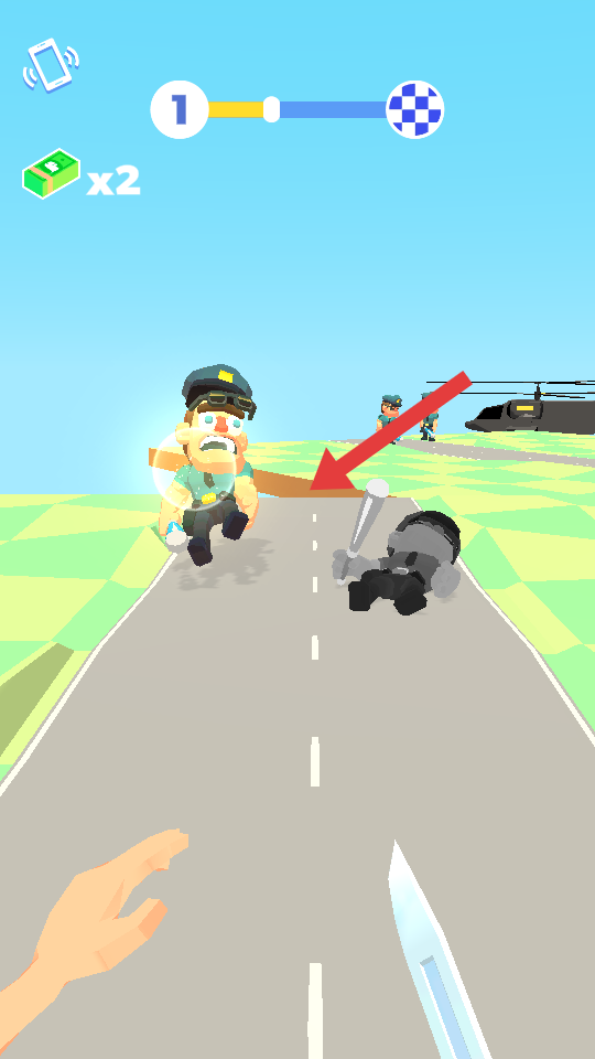 1、游玩中操控角色用武器來攻擊道路上的敵人,同時來收集空中的鈔票的道具,推進關卡的進度。
