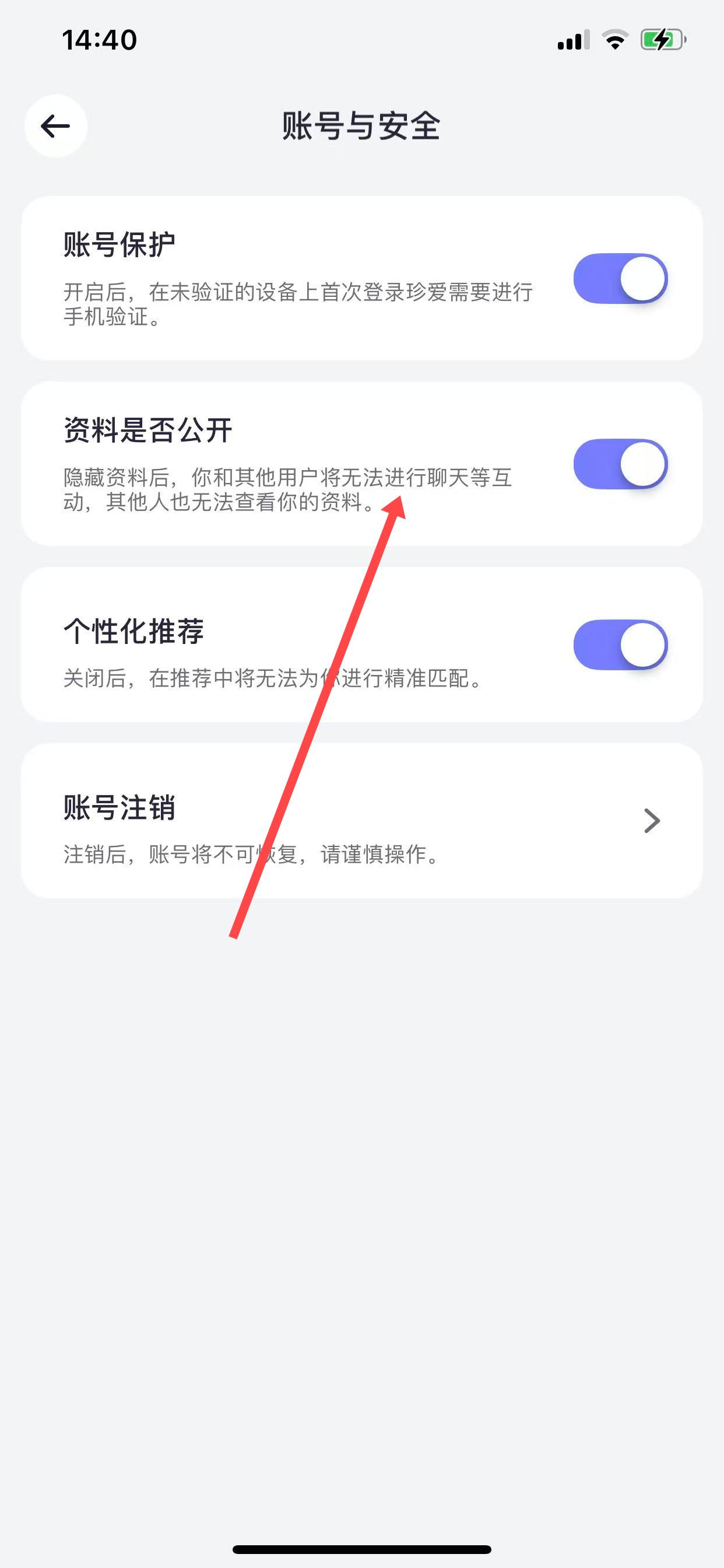 4、在賬號與安全頁面,找到資料是否公開的開關按鈕,點擊將其關閉,你的資料就會被隱藏。