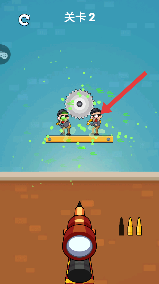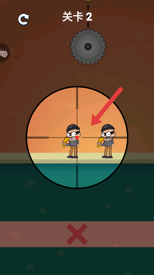 1、關(guān)卡2中,通過瞄準(zhǔn)鏡鎖定敵人時(shí),留意上方鋸片機(jī)關(guān),找準(zhǔn)時(shí)機(jī)射擊,可借助鋸片下落的機(jī)制輔助擊敗敵人。