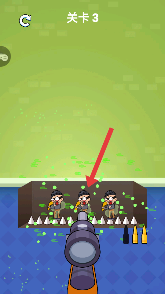 3、關(guān)卡3里,面對(duì)帶有尖刺的場景,瞄準(zhǔn)敵人進(jìn)行射擊,可直接攻擊敵人,留意場景機(jī)關(guān)與敵人互動(dòng),推進(jìn)關(guān)卡。