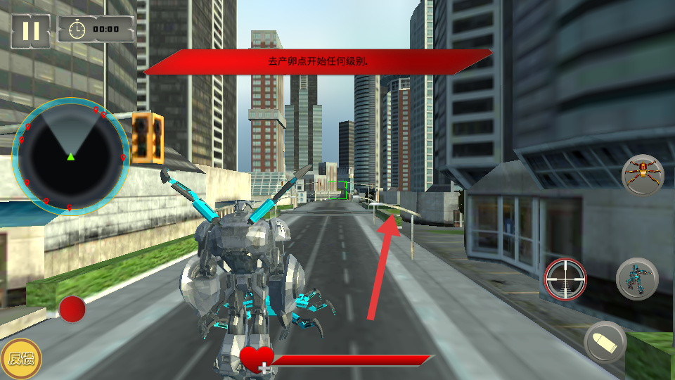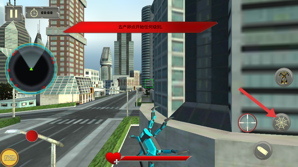 1、進(jìn)入游戲后直接解鎖變形蜘蛛機(jī)器人基礎(chǔ)形態(tài),通過(guò)虛擬搖桿控制機(jī)器人在城市地面移動(dòng),點(diǎn)擊攀爬按鈕即可附著在建筑墻面,開(kāi)啟垂直移動(dòng)探索。