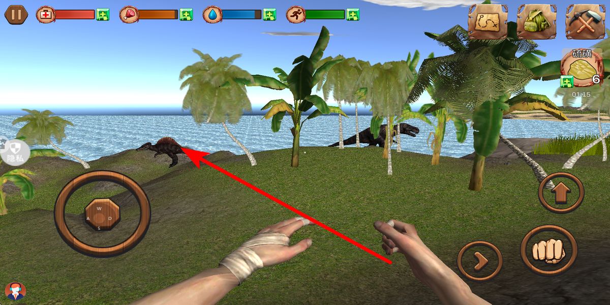 3、時刻留意周圍環(huán)境,當(dāng)發(fā)現(xiàn)恐龍靠近時,利用場景中的地形和障礙物,快速移動躲避恐龍的攻擊,尋找逃離恐龍島的路線。