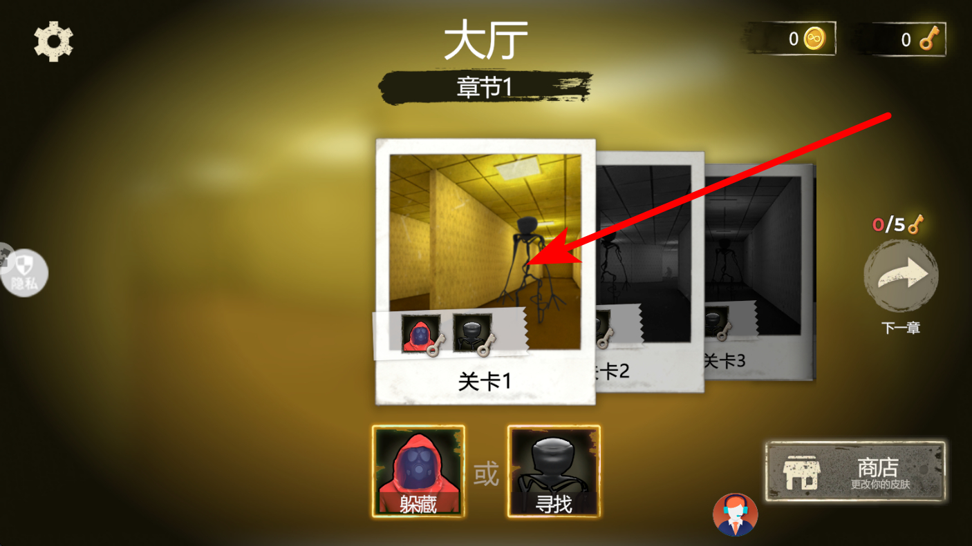 2、場景選擇界面,可選擇不同的關(guān)卡章節(jié)1的等進入,不同關(guān)卡有著不同的場景布局與危險情況,需根據(jù)場景特點采取應(yīng)對策略。