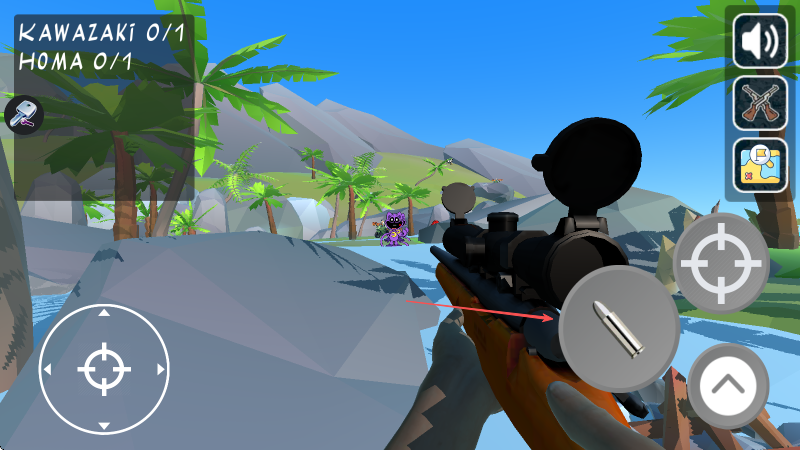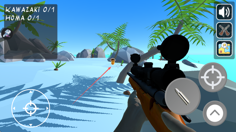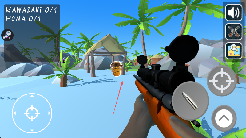 2、發(fā)現(xiàn)目標(biāo)后點(diǎn)擊屏幕右下方類(lèi)似子彈的按鈕開(kāi)槍射擊,若要調(diào)整射擊方向可滑動(dòng)屏幕來(lái)控制瞄準(zhǔn)方向。