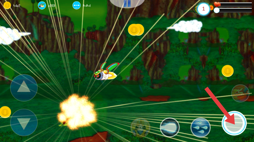 3、通過右側(cè)技能按鍵發(fā)射光束、觸發(fā)爆炸等特效,擊敗飛行的敵人帶翅膀的敵人單位,持續(xù)戰(zhàn)斗推進關(guān)卡。