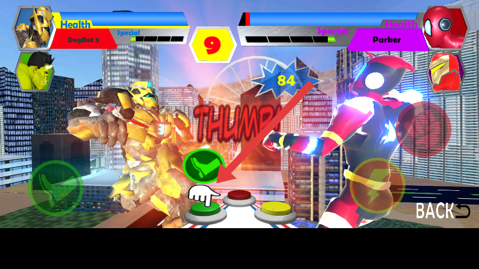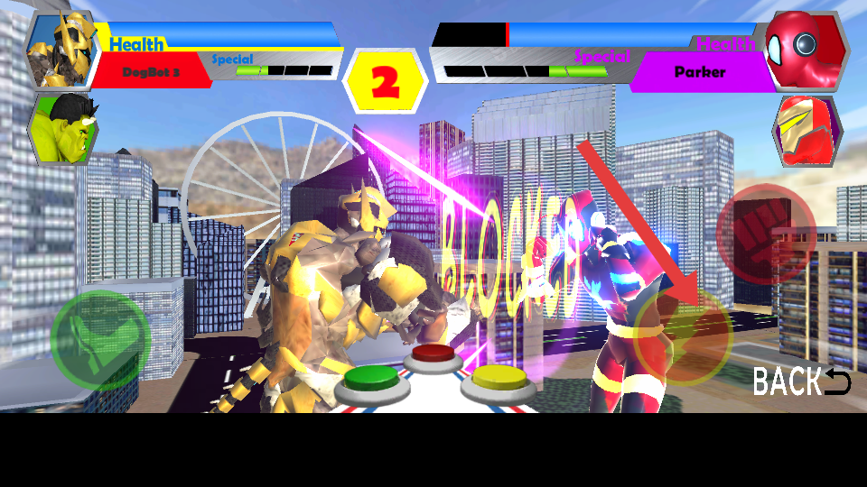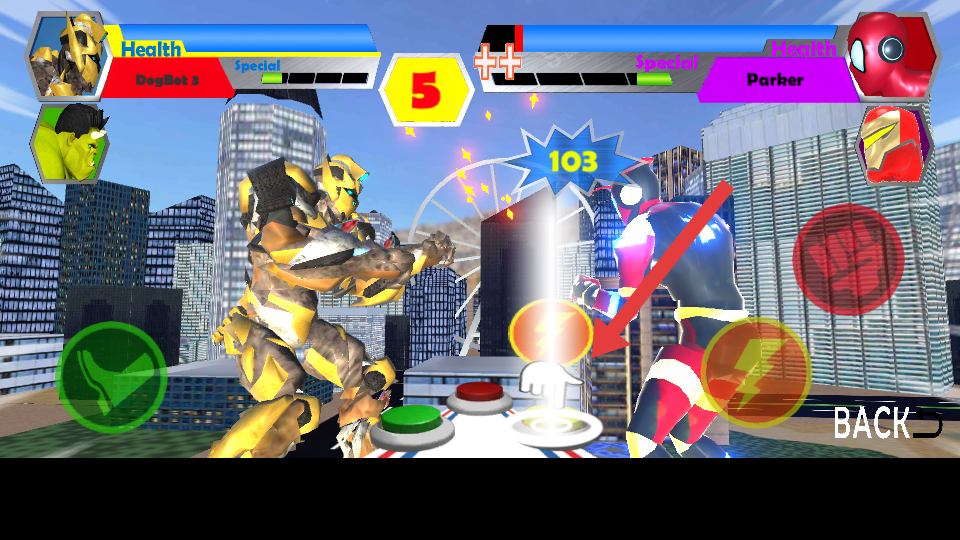 1、對(duì)戰(zhàn)角色包含黃色機(jī)甲DogBot3、紅紫機(jī)甲Parker,戰(zhàn)斗背景為城市建筑群有摩天樓、摩天輪等元素。