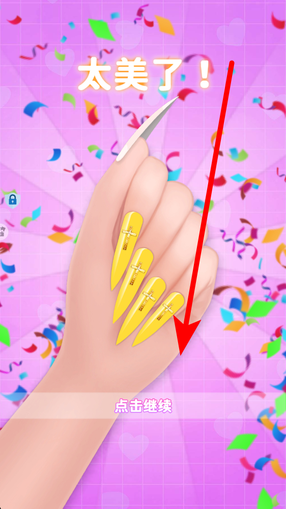 3、當甲油涂抹等步驟完成后,屏幕出現(xiàn)點擊繼續(xù)的提示時,點擊相應的區(qū)域,就能進入后續(xù)環(huán)節(jié),最終可以看到制作完成的美甲作品,享受美甲創(chuàng)作的樂趣。