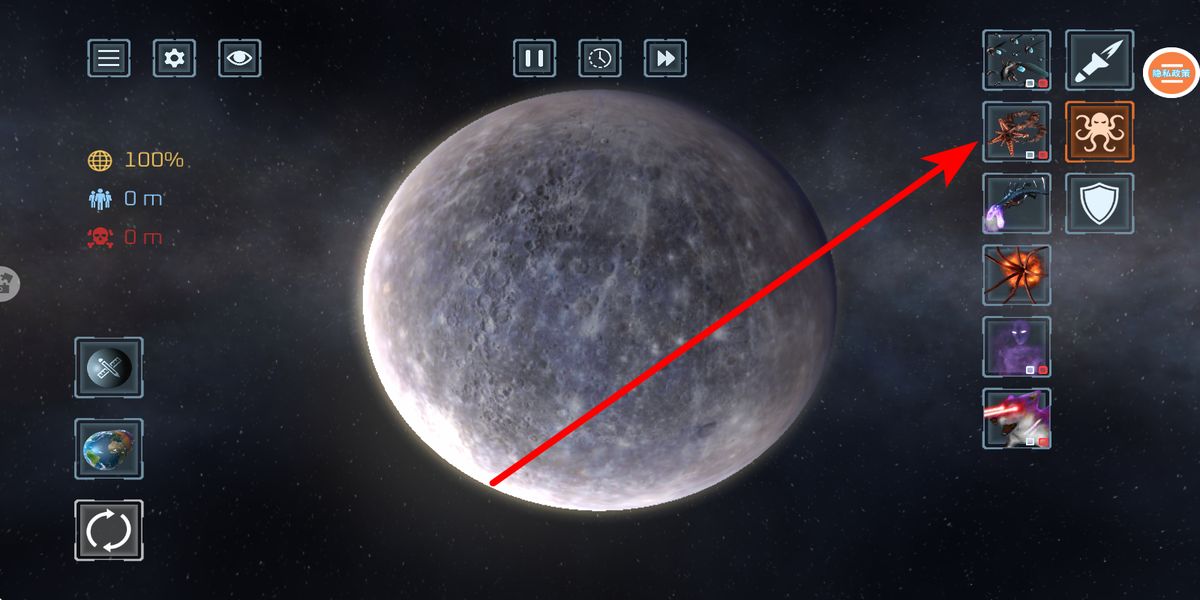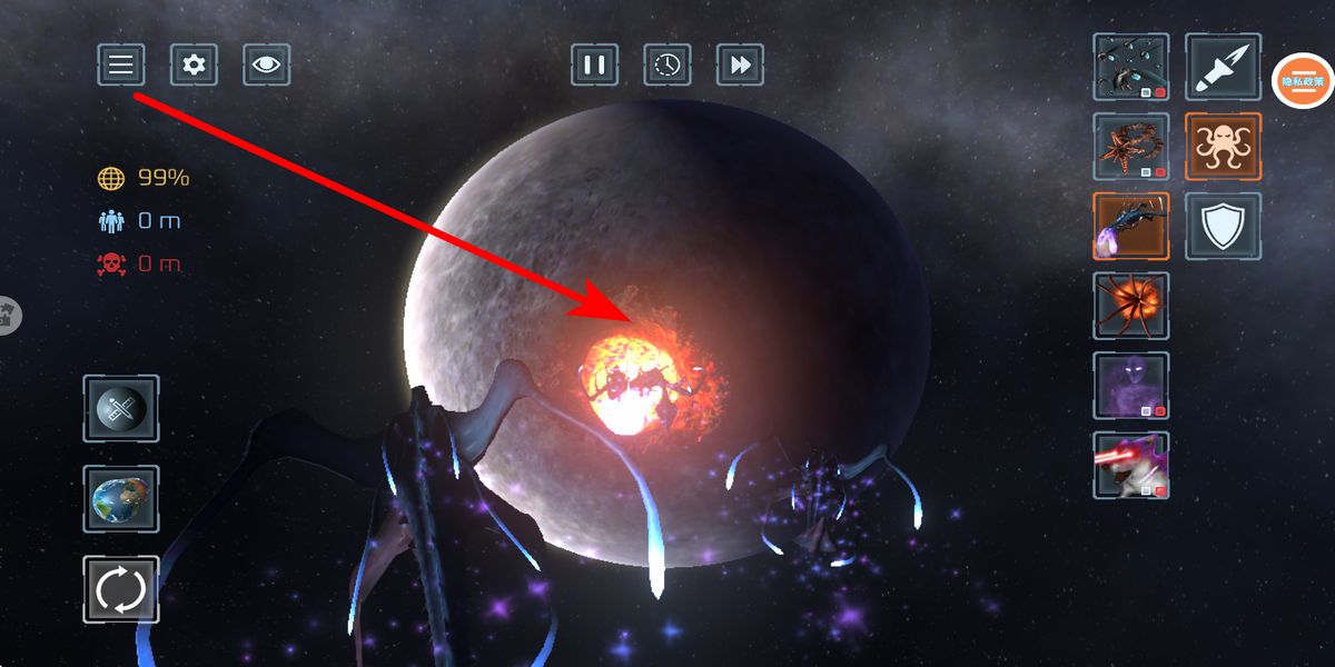 2、右側(cè)會(huì)出現(xiàn)各類道具,像不同的武器或特殊能力圖標(biāo),點(diǎn)擊這些道具,就能調(diào)用相應(yīng)手段對(duì)星球進(jìn)行破壞,感受毀滅星球的效果。