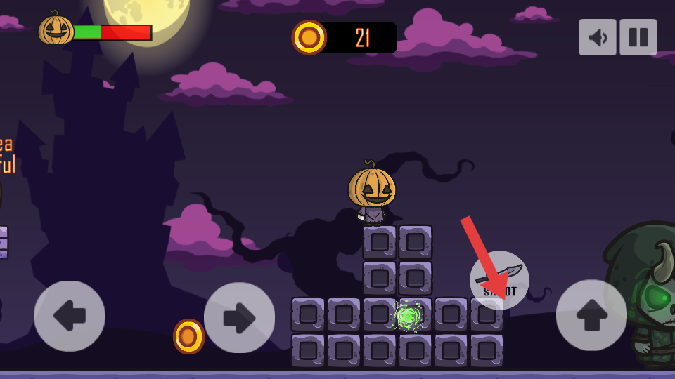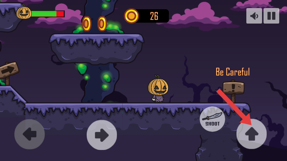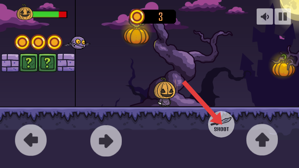 2、核心玩法,操控南瓜頭形象的角色,萬圣節(jié)風(fēng)格場景中進(jìn)行平臺(tái)跳躍探索,同時(shí)躲避或攻擊紫色小怪物、綠骷髏敵人。
